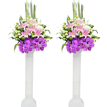 粉色绣球,粉百合,桔梗,紫色蝴蝶兰,巴西叶,罗马柱支架