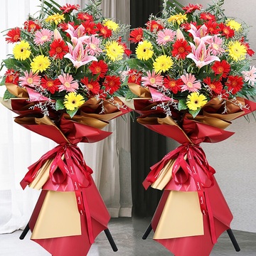 三脚架开业花篮,红+金色双面欧雅纸包裹,红色英文缎带束扎花语:门迎晓日财源广,户纳春风喜庆多。附送: