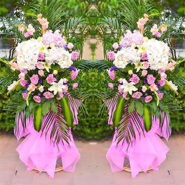 粉色棉纸篮身扎花,开业花篮花语:根深叶茂无疆业,源远流长有道财。附送: