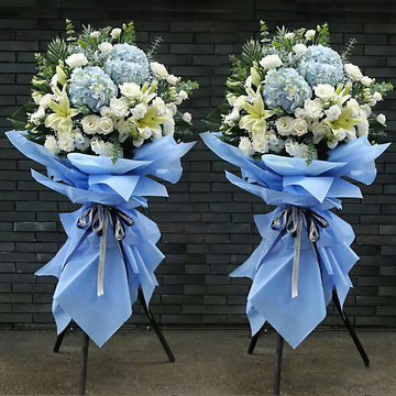 蓝色雾面纸、三脚架,黑色及白色缎带束扎。花语:敬贺开张,富贵吉祥附送: