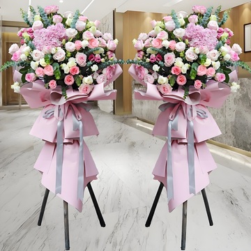 粉色纸束腰,三脚架开业花篮花语:财源滚滚达三江,生意兴隆通四海。附送: