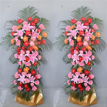 金纸裹篮身,三层开业花篮花语:财源滚滚达三江,生意兴隆通四海。附送: