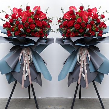 三脚架开业花篮,蓝灰色欧雅纸束腰花语:吉星高照,财运享通。附送: