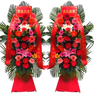 红色棉纸裹身,双层开业花篮花语:祝生意好好,荷包满满,赚钱多多,红红火火。附送: