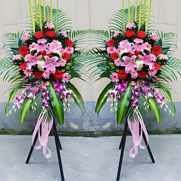 粉色缎带蝴蝶结,三脚架花篮花语:开业兴隆,财兴旺;财源茂盛,达八方。附送: