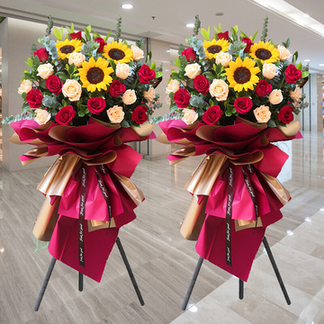 红金色包装纸,三脚架开业花篮花语:一点公心平似水,十分生意稳如山。附送: