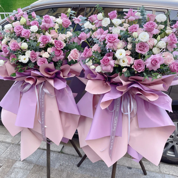 17支紫霞仙子,9支粉佳人玫瑰,11支白桔梗,1扎折射泡泡