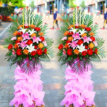 红色棉纸扎花,单层开业花篮花语:门迎晓日财源广,户纳春风喜庆多。附送: