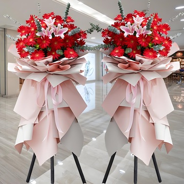 三脚架开业花篮花语:庆开业典礼,祝生意如春浓,财源似水来!附送: