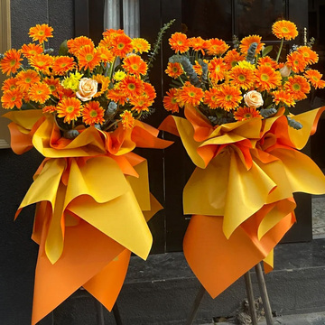 橙色黄色双面欧雅纸束腰三脚架花篮花语:祝贺你开业兴隆,财兴旺,财源茂盛,达八方。附送: