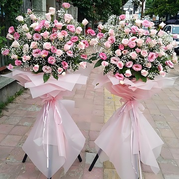 三脚架花篮,粉色纸束腰花语:开业大吉,生意兴隆,宾客如云附送:
