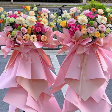 粉色束腰,三脚架花篮花语:生意兴隆,财源滚滚!顾客盈门,财源似海。附送: