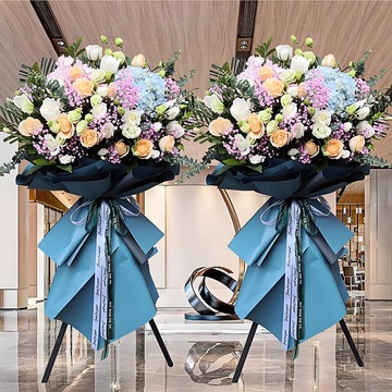 水蓝色纸包装,三脚架花篮花语:新春迎新气,福地启福门附送: