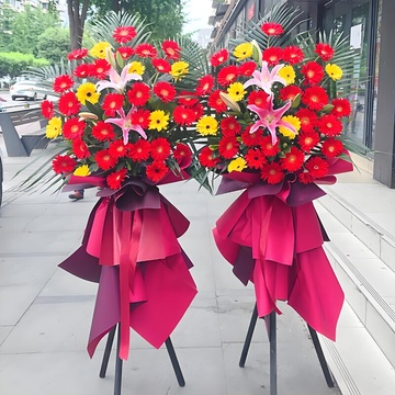 酒红色纸束腰,三脚架花篮花语:年年乐享万事亨通,月月吉拥步步成功附送: