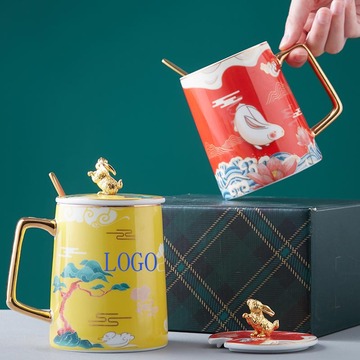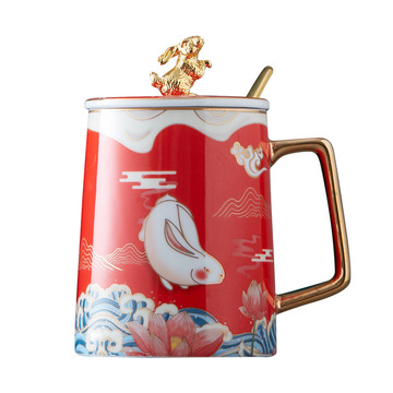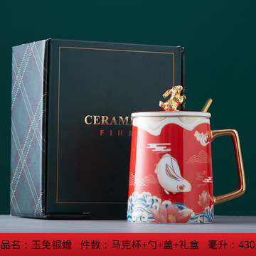 中国风陶瓷杯礼盒装玉兔国潮办公室水杯带勺带盖伴手礼国潮马克杯 玉兔银蟾-红色