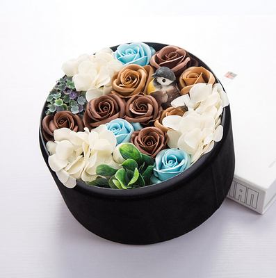 高档绒布圆形礼盒包装花语:若是你闻过了花香浓,别问我的花儿为谁红,爱过知情重,醉过知酒浓,花开花谢终是空,缘分不停留,像春风来又走,女人如花花似梦。附送: