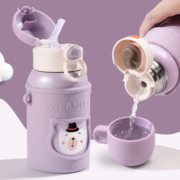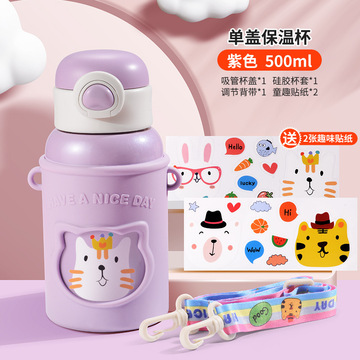 卡通儿童保温杯316高颜值学生不锈钢水杯硅胶套吸管杯子便携 紫色+硅胶套+贴纸+背带