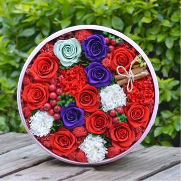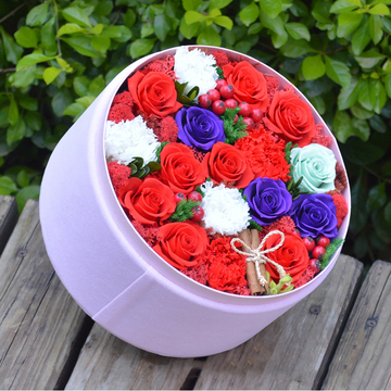 玫瑰、康乃馨、仿真红果、苔藓、桂皮永生花