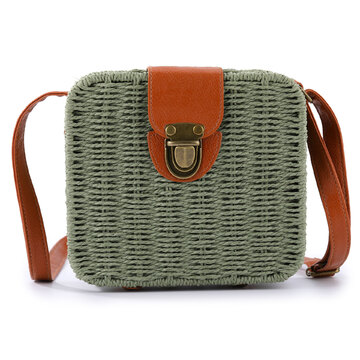 草编斜跨包包森系编织小方包纯色休闲简约沙滩草编包包女 复古绿